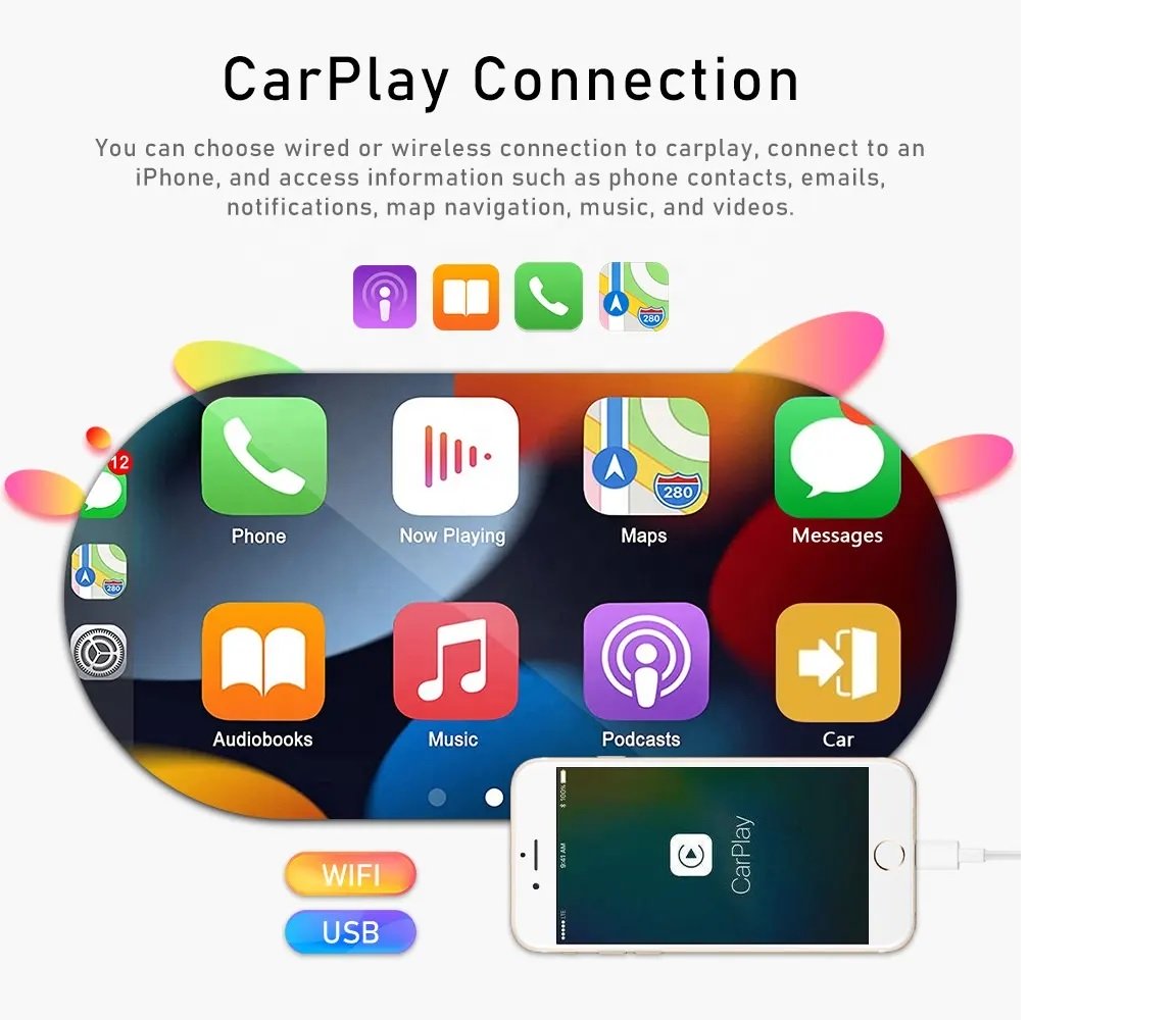 2. Bezdrátové Carplay: Můžete se bezdrátově připojit k Carplay, připojit se k mobilnímu telefonu Apple, získat přístup k adresáři mobilního telefonu, poště, oznámení, mapové navigaci, hudbě, videu a dalším informacím a realizovat hlasové ovládání.