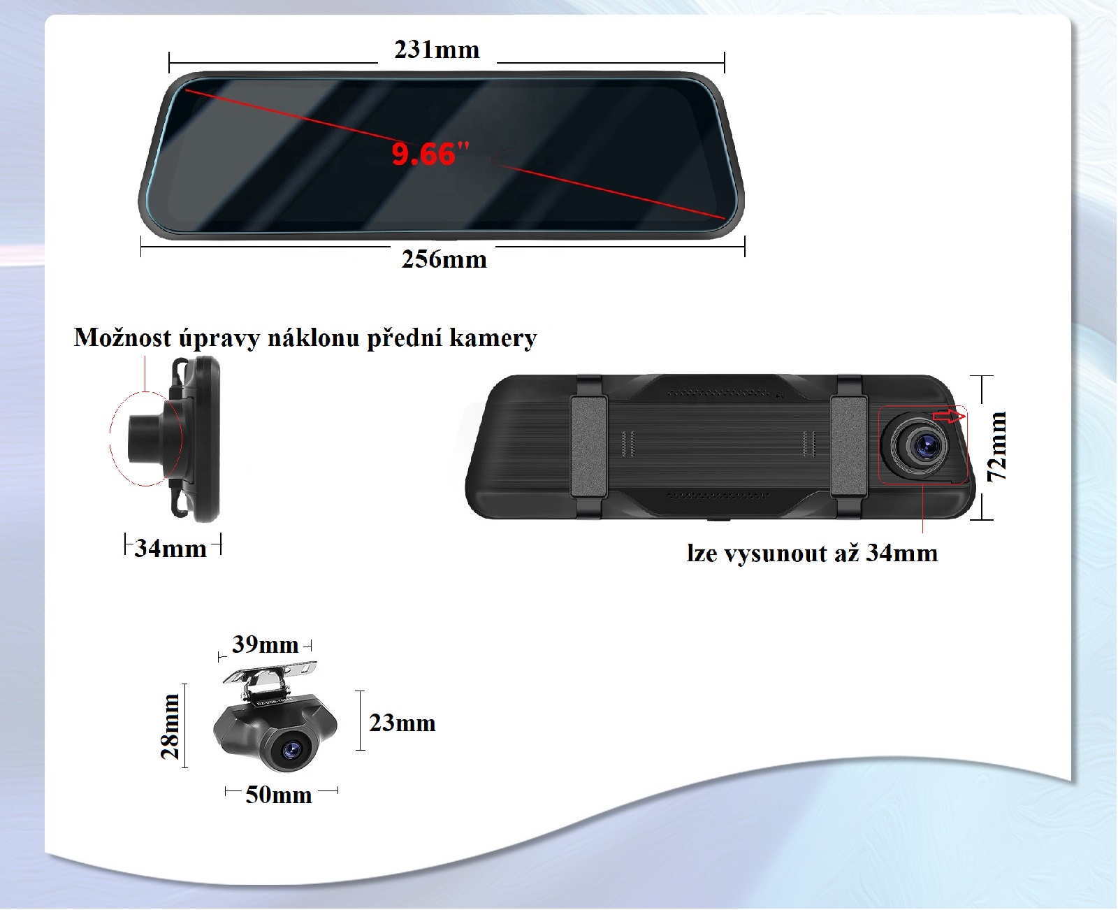 Parkovací set s přední i zadní kamerou, kdy pro zobrazení obrazu kamer slouží monitor ve zpětném zrcátku s dotykovým displejem o velikosti 9,66 palce. Umožňuje přehled kolem vašeho vozu, včetně záznamu z jízdy.