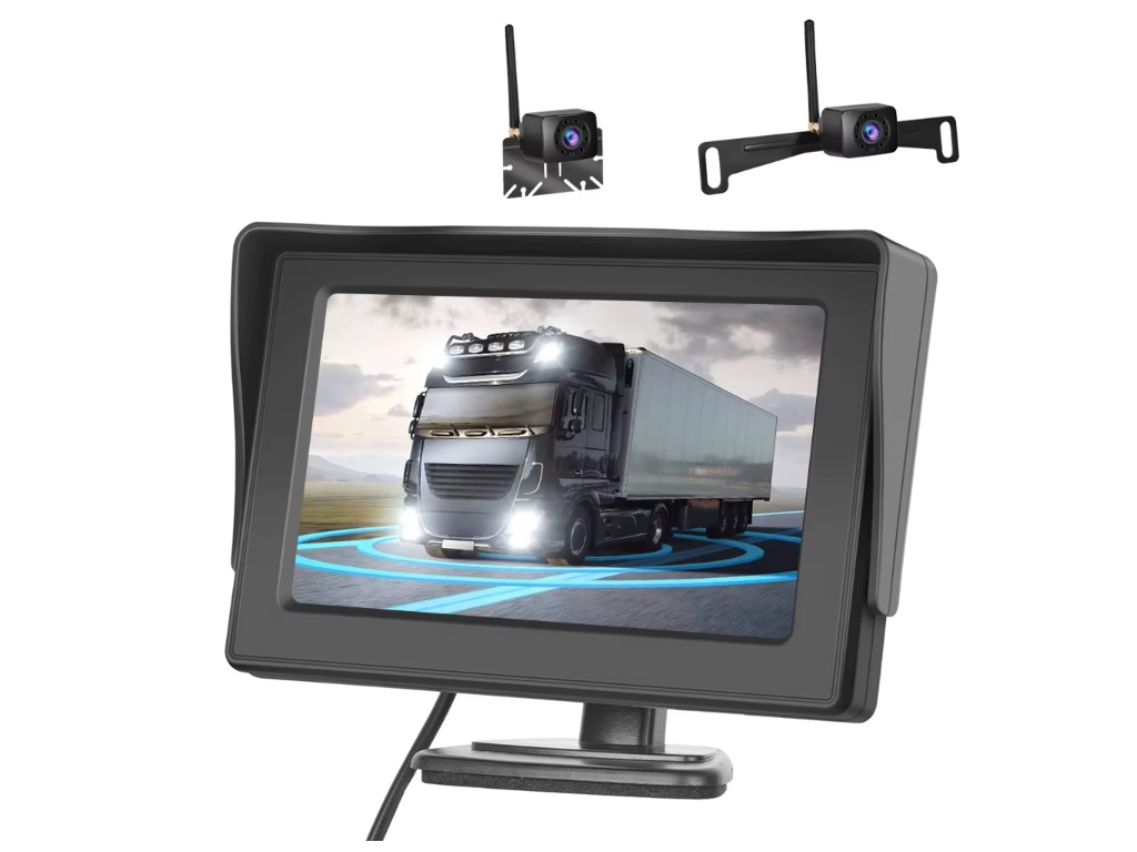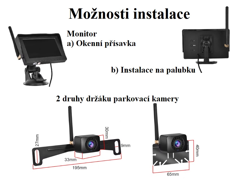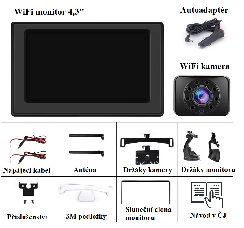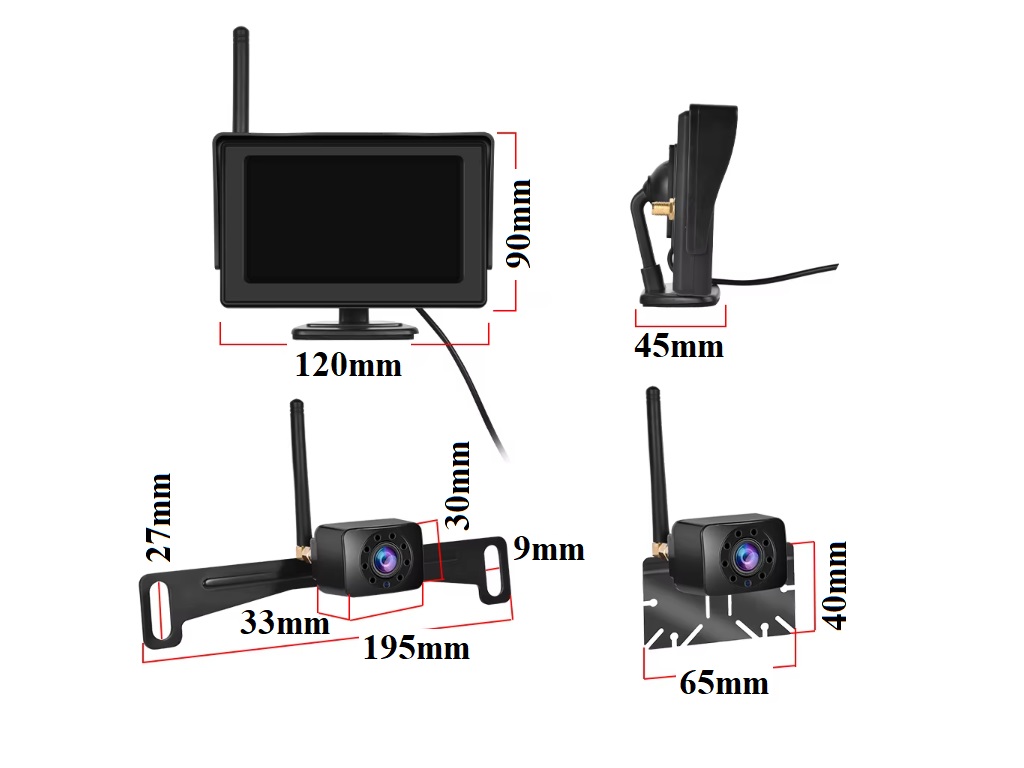 WiFi parkovací set A3164 obsahující monitor o velikosti 4,3" a parkovací kameru s nočním viděním s držákem SPZ je kompletní sada, která vám poskytne jasný přehled o dění za vozidlem. Díky bezdrátovému přenosu, vodotěsné kameře a displeji s vysokým rozlišením je instalace snadná a obraz ostrý za všech podmínek.