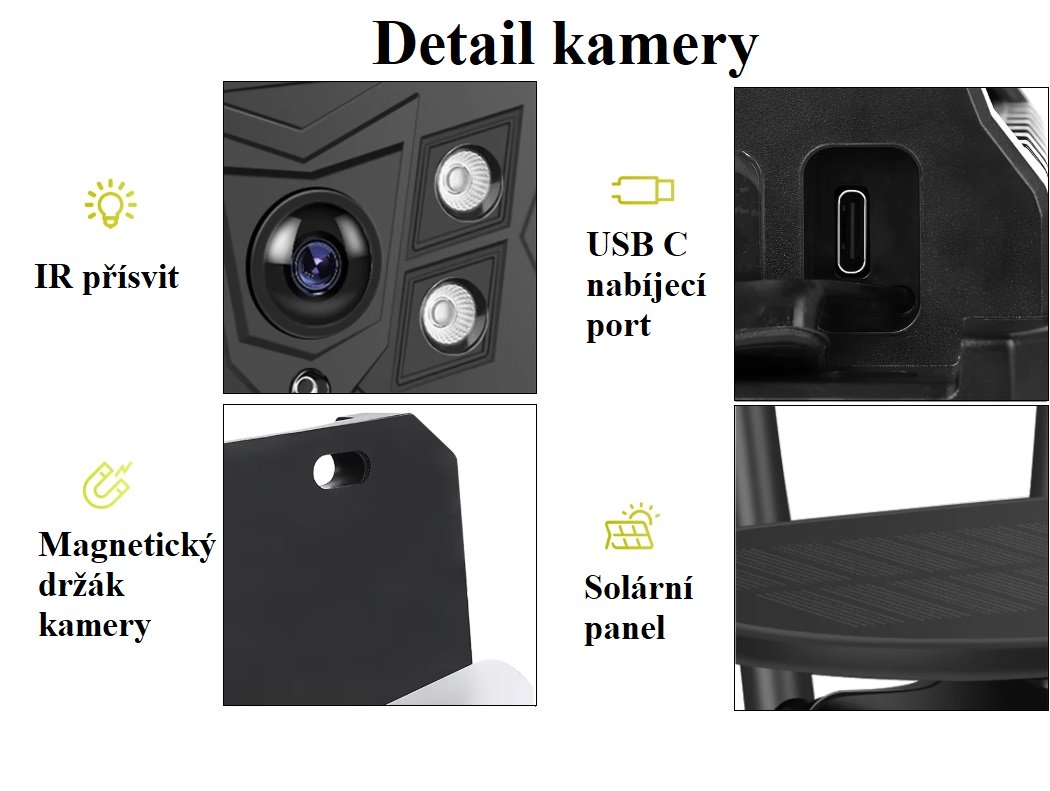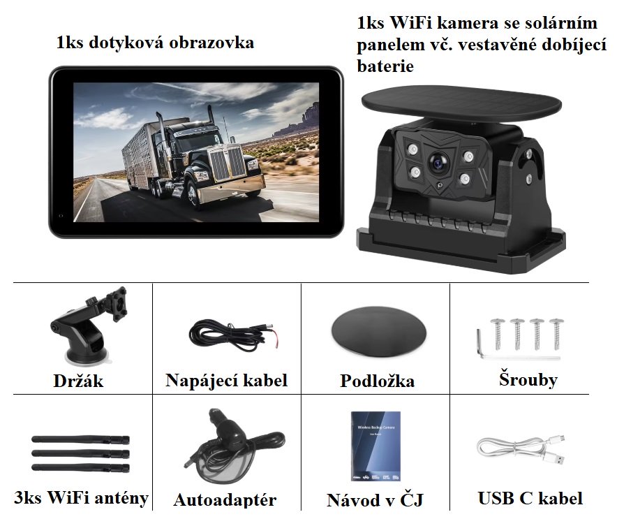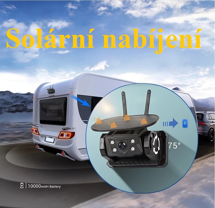 Přenos dat mezi kamerou a monitorem je pomocí vlastního WiFi signálu vysílaného z monitoru. Pro napájení monitoru jednoduše připojte do autozapalovače pomocí přiloženého autoadaptéru. Napájení kamery zajišťuje vestavěná baterie dobíjená solárním panelem, umístěným přímo na kameře. Pro ruční dobíjení kamery je k dispozici USB C nabíjecí port, který umožňuje nabití kamery pomocí napájecího adaptéru 5V.