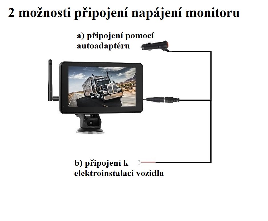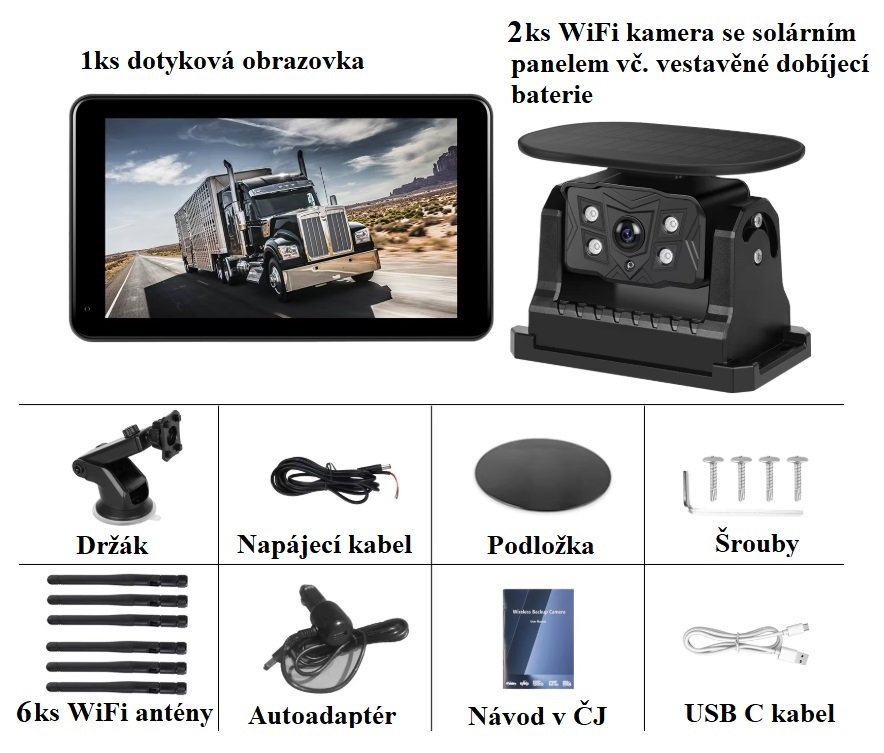 Přenos dat mezi kamerami a monitorem je pomocí vlastního WiFi signálu vysílaného z monitoru. Pro napájení monitoru jednoduše připojte do autozapalovače pomocí přiloženého autoadaptéru. Napájení kamer zajišťuje vestavěná baterie dobíjená solárním panelem, umístěným přímo na kameře. Pro ruční dobíjení kamer je k dispozici USB C nabíjecí port, který umožňuje nabití kamery pomocí napájecího adaptéru 5V.