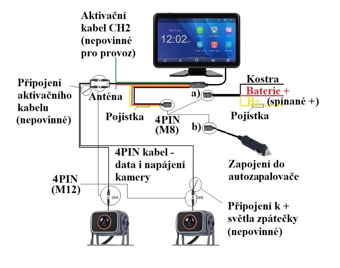 • Aktivace kamer - Zadní kameru lze aktivovat pomocí aktivačního kabelu, kdy se daná kamera automaticky zobrazí jako jediná na celou obrazovku. Zadní kamera zobrazí i parkovací linie