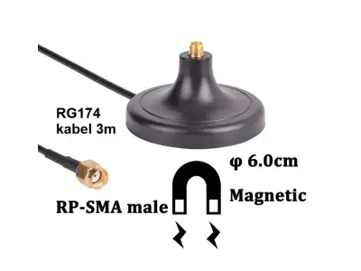 Magnetický držák wifi antény s kabelem RG 174 a konektorem RP-SMA, jak je na obrázku