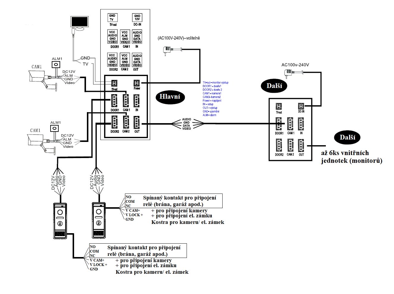 Externí zařízení: tato sada podporuje také zapojení přídavných zařízení, jako je elektrický zámek, CCTV kamera nebo dodatečné monitory. Lze připojit až 2 video zvonky, 6 ovládacích monitorů, 2 CCTV kamery (CVBS, AHD 2Mpx), 1 externí monitor (pouze zrcadlení ovládácího monitoru), 2 detektory/čidla pro spuštění nahrávání připojených kamer.
