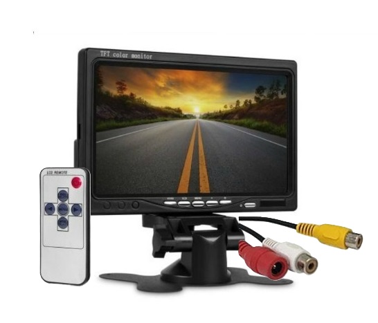 Univerzální LCD TFT monitor s oddělitelným rámečkem pro vestavnou instalaci monitoru do např. palubní desky nebo možnost postavit na nastavitelný držák (rámeček i držák je součástí balení). vstup video a audio pro připojení barevné kamery, couvací automobilové kamery, vhodný na cesty i pro sledovací kamerový systém.