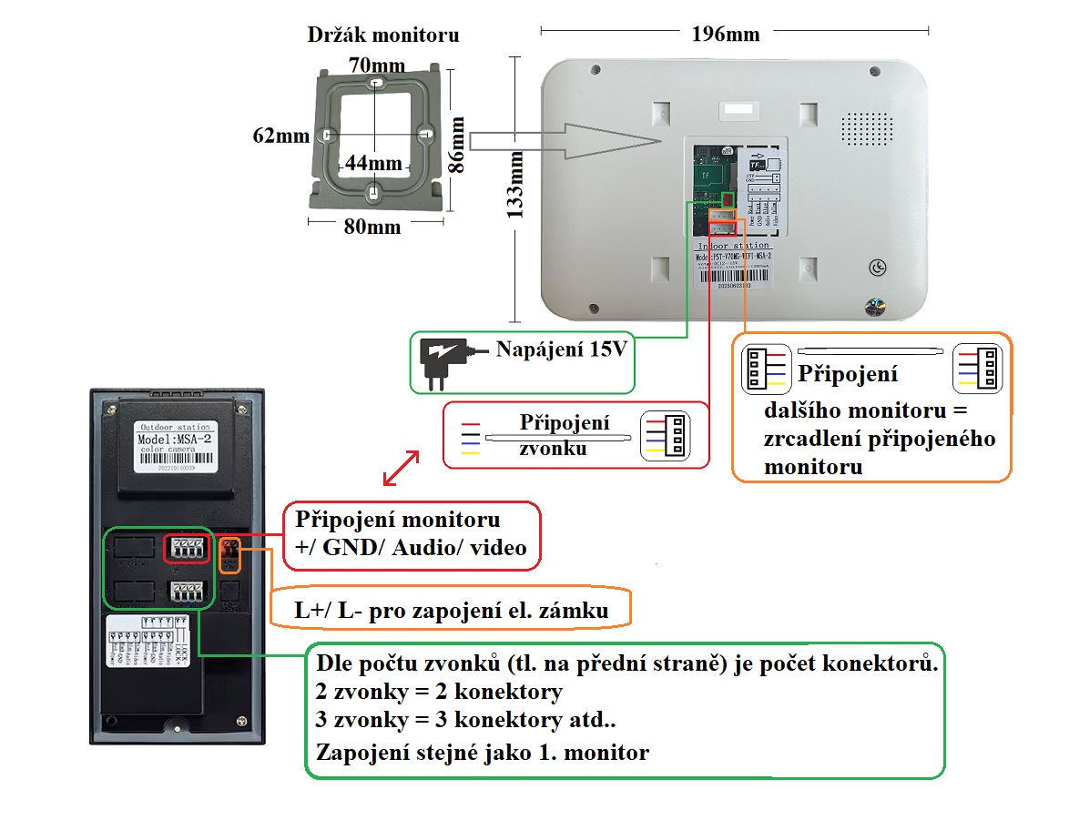 Snadná instalace: Video zvonek kabelově propojíte s monitorem (do 28m=4-0,2mm², do 50m=4*0,3mm², do 80m=4*0,4mm²) a systém je funkční. Pro možnost sledovat dění v mobilním telefonu stačí spárovat s aplikací Tuya Smart/Smart Life, které si stáhnete ZDARMA do mobilního telefonu, tabletu.